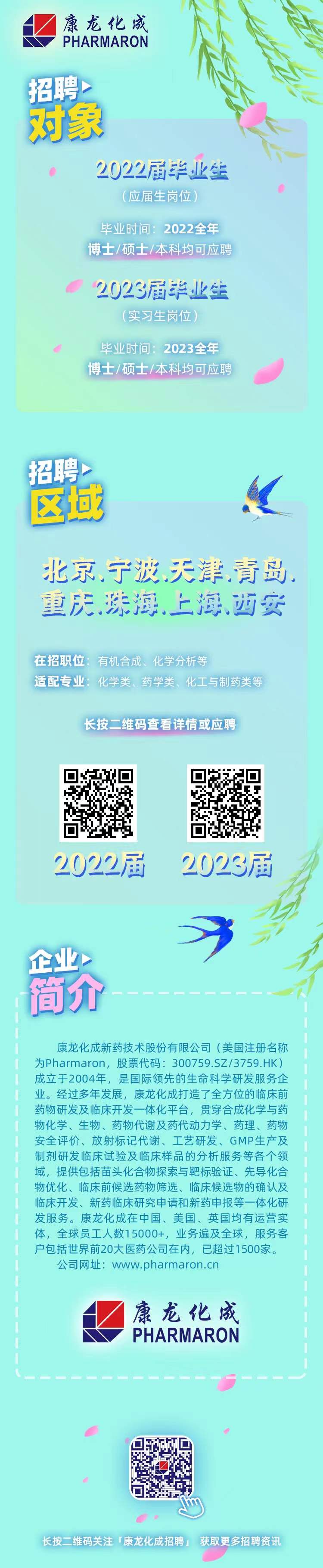 【康龙化成2022届&2023届春招正式启动】 招聘对象:2022&2023届-本硕博 适配专业:化学类、药学类、化工与制药类、 工作地点:北京、宁波、青岛、重庆、天津、上海、西安、珠海 薪酬在行业内具有竞争力!深耕科研一线,探索成长边界! A+H股上市公司,千亿市值,生命科学研发服务行业龙头,参与全球顶级医药企业的前沿项目! 加入康龙化成,为人类健康做一份贡献,为自己收获无限可能! 2022届&2023届简历投递链接:https://app.mokahr.com/campus-recruitment/pharmaron/43561