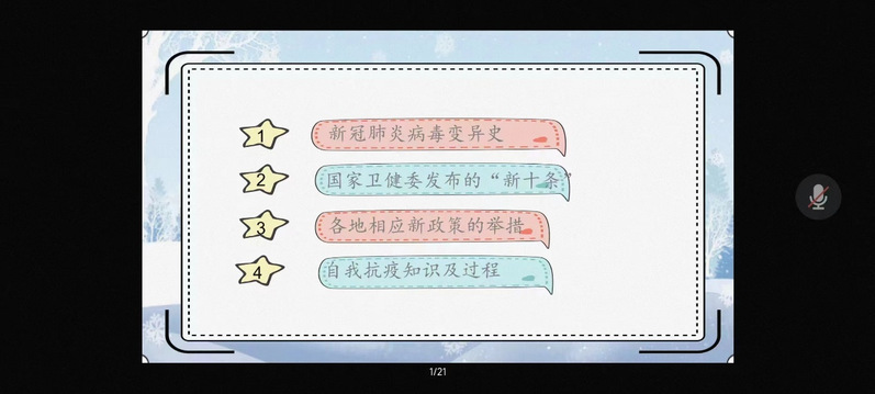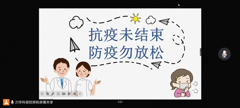 为响应国家号召,加深同学们对“新十条”的了解,呼吁同学们做好个人防护,12月17日下午,我院青年志愿社于腾讯会议线上平台开展了“抗疫未结束,防疫勿放松”主题团日活动。 本次活动由本科生郭欣婷主持。活动伊始,郭欣婷以“三年抗疫,我们同心走过”为契机,引出本次活动主题——“抗疫未结束,防疫勿放松”。接着,郭欣婷介绍到,病毒的传播能力虽然增强,但致病率减弱,给人群带来的整体健康风险趋于缓和,在大规模疫苗接种和新冠病毒不断变异的背景下,“新十条”应运而生。随后,郭欣婷向同学们展示了“新十条”的具体内容,同时从新闻报道中截取“新十条”相关片段,分享各地响应新政策的举措。活动最后,郭欣婷通过播放记录新冠肺炎患者从确诊到康复的抗疫视频,帮助同学们认识到感染新冠病毒并不可怕,拥有良好的心态,做好自我防护才是最重要的。至此,本次活动圆满结束。 本次活动的顺利召开,不仅让社员们了解了疫情防控新政策,同时也呼吁大家积极响应号召,自觉遵守“新十条”规定,做好个人防护,营造良好的防疫氛围! (化学化工学院 李曼晴 郭家乐) |