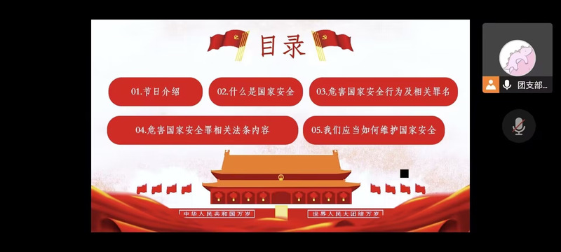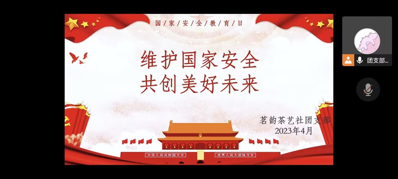 为进一步促进学生增强国家安全意识,学习国家安全法律知识,切实履行和维护国家安全的法律义务,4月29日,我院茗韵茶艺社举办的“维护国家安全,共创美好未来”团日活动于腾讯会议线上平台开展。