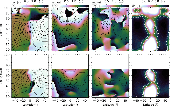 图1. 季节变化(1–3列分别对应于年变化、半年变化和1/3年变化)的振幅(等值线)和相位(颜色)以及拟合优度R2 (第4列)。上下两行分别表示重构风场和MERRA-2风场的结果。