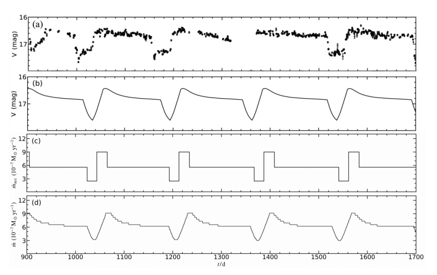 图2. (a) 观测上超软X射线源的光变曲线;(b) 本研究成果中的白矮星吸积模型理论光变曲线; (c) 模拟中白矮星的物质转移速率;(d) 本研究成果中的物质转移速率曲线。