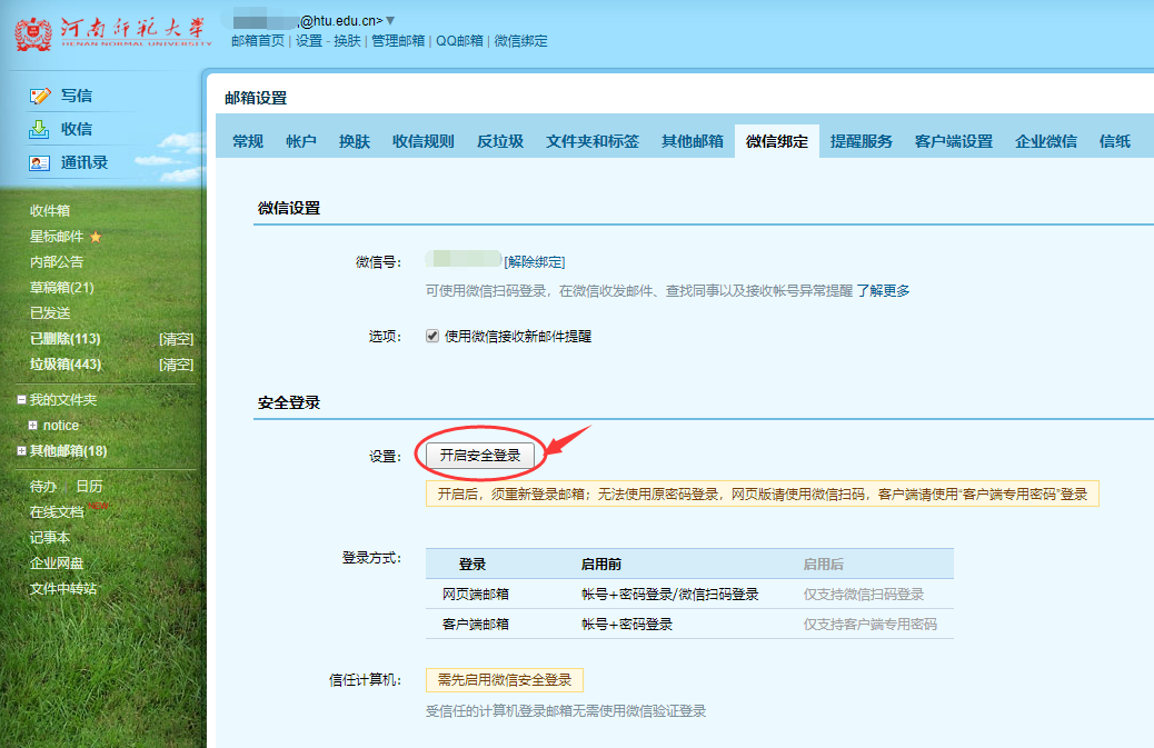 第二步:在个人邮箱中,点击“微信绑定”,开启“安全登录 ”。
