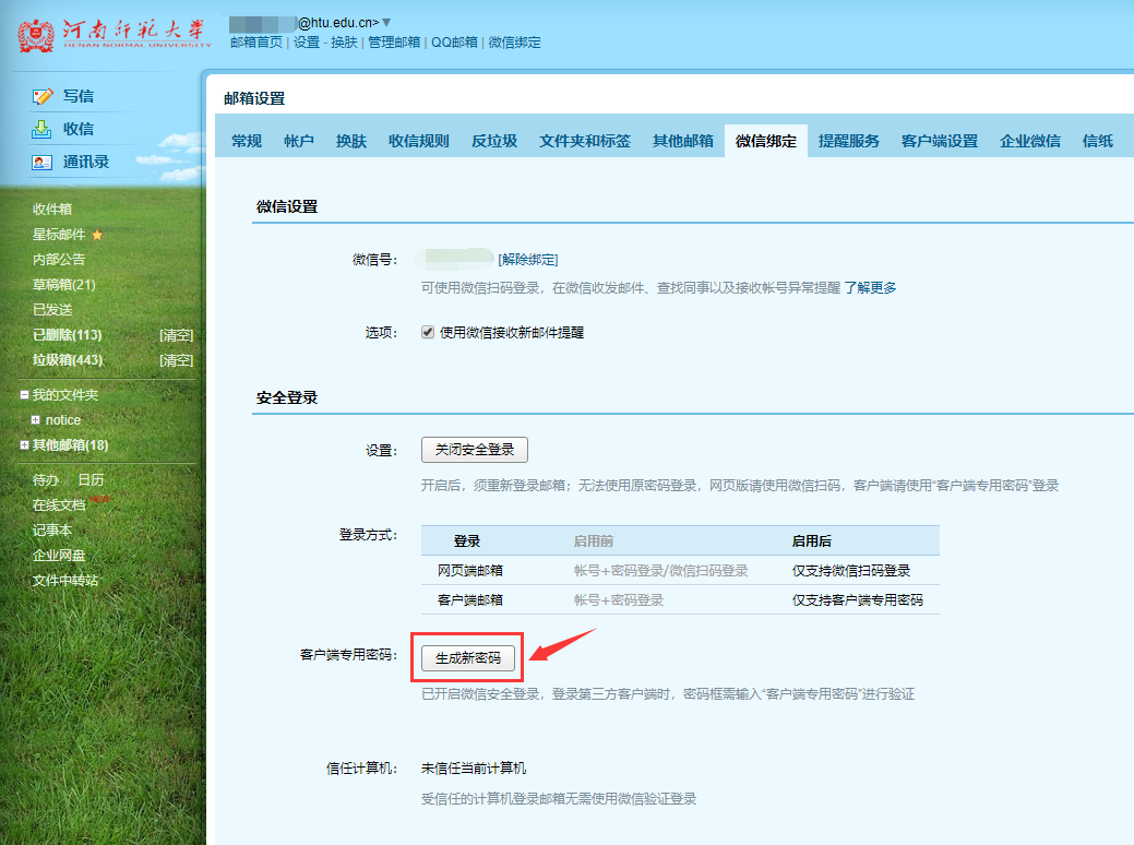第三步:在个人邮箱中,点击“微信绑定”。找到客户端专用密码,点击【生成新密码】。