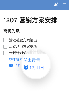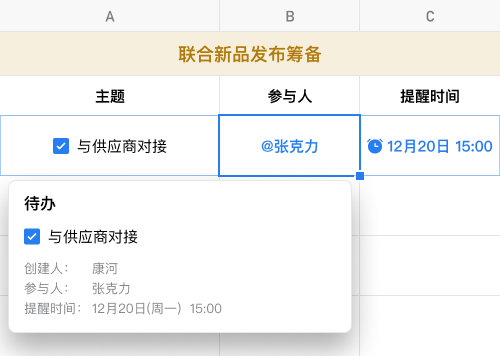 可将待办插入文档,@ 成员即可完成分配,支持定时提醒