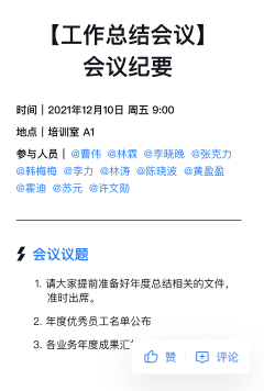 可在文档内 @ 成员快速发起讨论,在文档动态进行评论互动