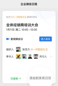 提供了高效组织会议和管理公共日历的能力,还可以邀请同事、微信客户、上下游一起参与日程