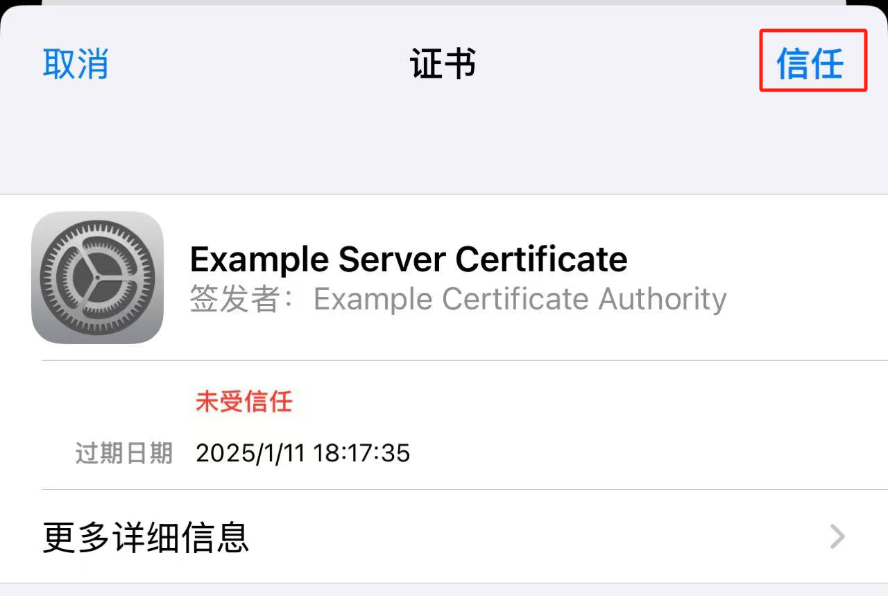 3. 第一次连接需要确认服务器证书,点击“信任”,也可以通过查看“更多详细信息”判断真伪。