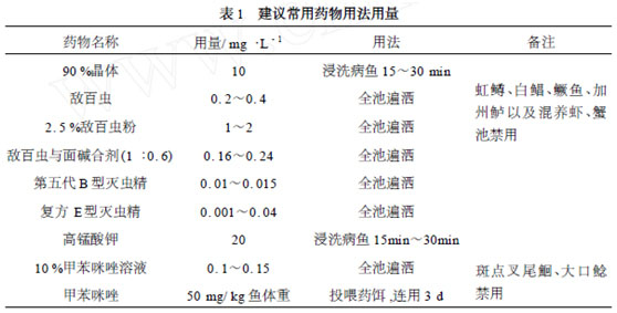 药物选择、使用及休药期符合N Y 5071《无公害食品渔用药物使用准则》和N Y 5070《无公害食品水产品中渔药残留限量》的规定。常用的药物治疗方法见表1 。