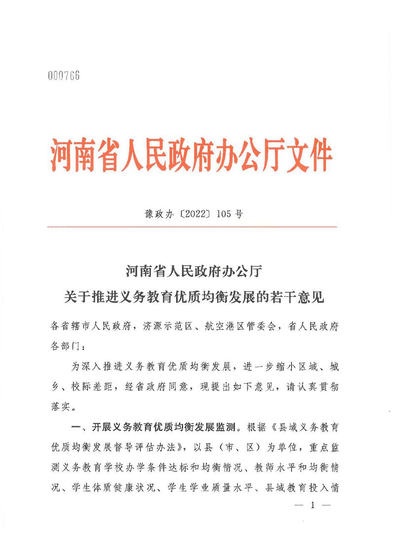 豫政办〔2022〕105号《关于推进义务教育优质均衡发展的若干意见》河南省人民政府办公厅