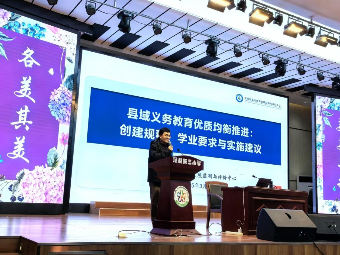 3月9日下午,范县教育局邀请河南省基础教育发展监测与评价中心监测实施部主任刘锦一行,赴濮阳市范县开展以“县域义务教育优质均衡推进:创建规程、学业要求与实施建议”为主题的培训。局长张善友带领局班子成员、创建办全体人员、教师发展中心各学科教研员、中小学校长及全县小学四年级和初中八年级相关学科教师代表,共计670余人参加了此次培训。培训会由范县教育局党组成员、第三小学校长白秀娟主持。