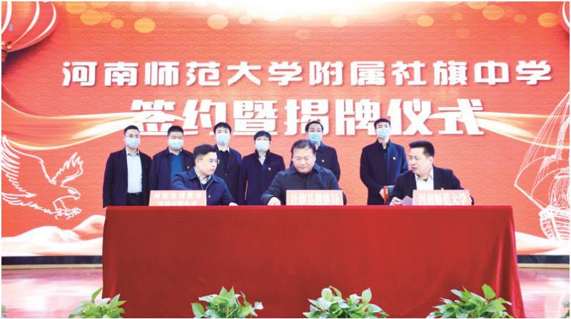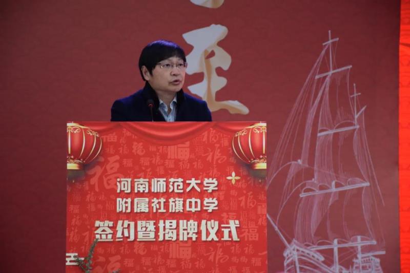 上午十一时,仪式正式开始。社旗县副县长张耀一、我校副校长李学志、河南达清教育发展有限公司董事长张颖等先后发表了热情洋溢的讲话,从不同角度表达了统筹各方面资源和优势、齐心协力办好附属社旗中学的愿望、信心和决心。在与会领导和师生的共同见证下,我校基础教育集团办公室主任张银付、社旗县教育体育局局长陈涛、河南达清教育发展有限公司董事长张颖等共同签署了合作办学协议。签约仪式结束后,李学志、余广东两位领导带领与会师生移步学校大门口,为附属社旗中学举行了隆重的揭牌仪式。