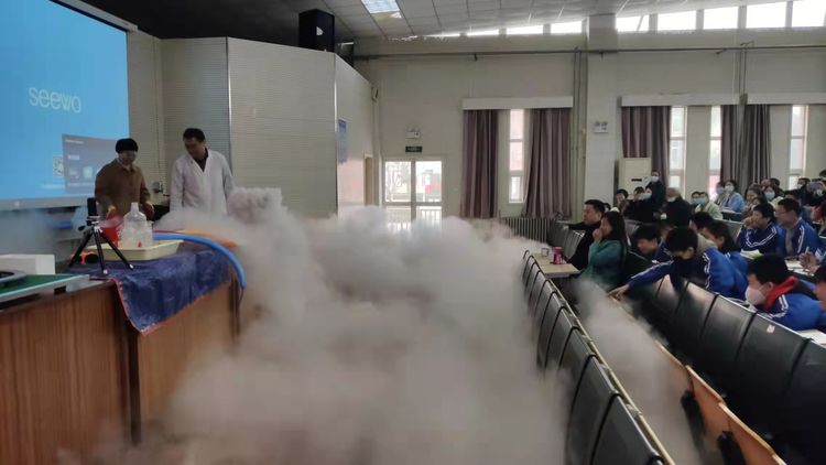 张银付和武春香分别就本次活动作开幕讲话,秦凡丽参与液氮云实验开启了奇妙科学实验展演活动。随后,马恒为师生们展演了液氮云、超导磁悬浮、液氮冷冻蔬菜树叶、液氧、面粉燃烧、打气喷火、陀螺仪、轮胎挂绳、角动量守恒、大象牙膏、大气压威力、酸碱指示剂、伯努利兵乓球、气球环等科学实验。这些小实验蕴含着科学大道理,让师生们感受到了科学的魅力,现场气氛热烈,学生们踊跃参与。