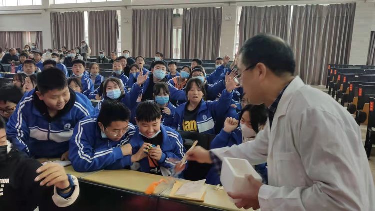 张银付和武春香分别就本次活动作开幕讲话,秦凡丽参与液氮云实验开启了奇妙科学实验展演活动。随后,马恒为师生们展演了液氮云、超导磁悬浮、液氮冷冻蔬菜树叶、液氧、面粉燃烧、打气喷火、陀螺仪、轮胎挂绳、角动量守恒、大象牙膏、大气压威力、酸碱指示剂、伯努利兵乓球、气球环等科学实验。这些小实验蕴含着科学大道理,让师生们感受到了科学的魅力,现场气氛热烈,学生们踊跃参与。