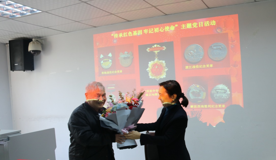 郑其腾首先介绍了我校离休干部俞雄同志的革命和工作经历。青年党员代表为老前辈献上了鲜花。俞雄老前辈表达了对党、政府、学校及离退处处处关怀离休干部的由衷感谢,接着从1948年11月14岁时参加革命队伍讲起,简要回顾了先后参加淮海战役、渡江战役、进军大西南、抗美援朝等的革命生涯,重点讲述了金城阻击战、上甘岭战役等战斗过程中,英雄的志愿军战士不畏天寒地冻衣单少食、无惧飞机大炮狂轰乱炸,在党中央的坚强领导下,机智聪明挖坑道、英勇顽强胜顽敌的革命故事。