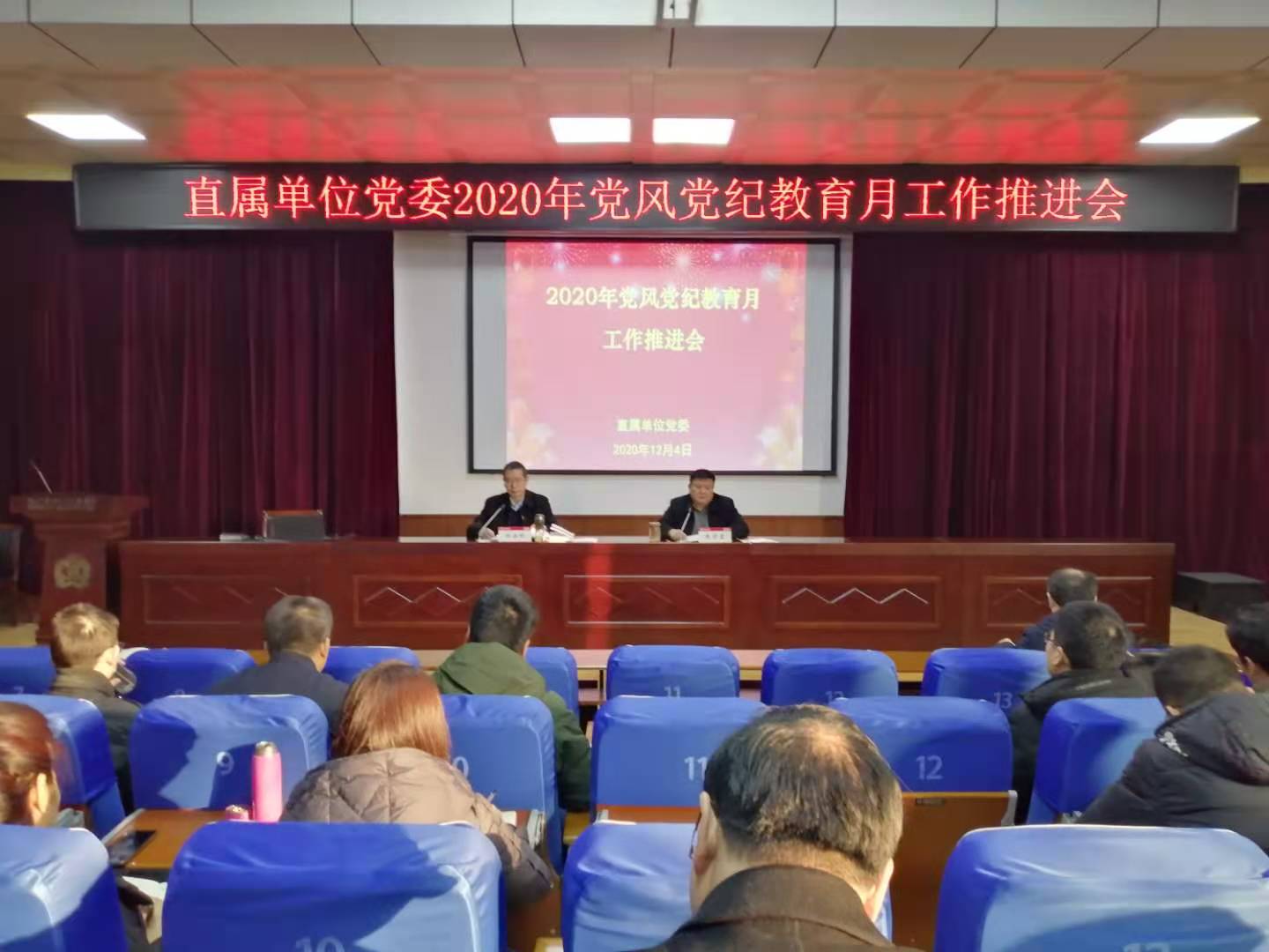 12月4日上午,直属单位党委在新五五四楼党校教室召开2020年党风党纪教育月工作推进会,直属单位全体党员干部参加会议。
