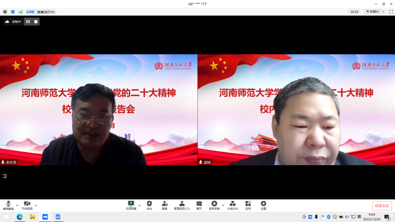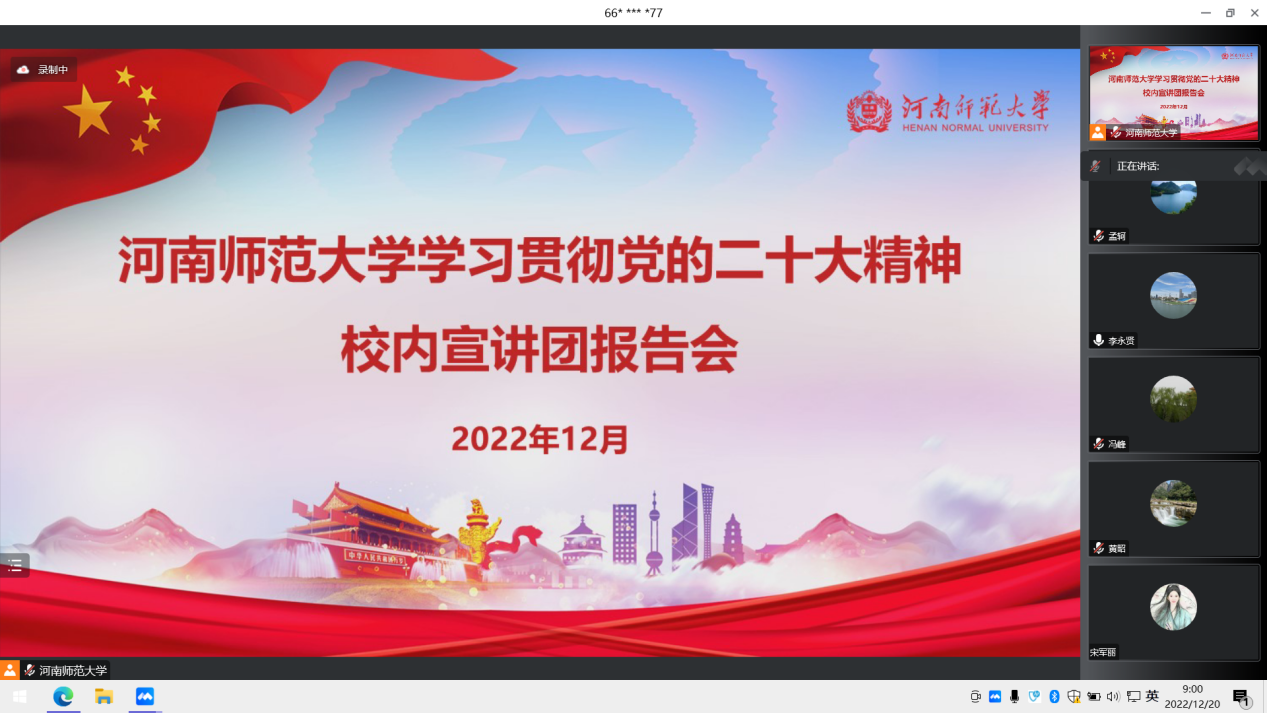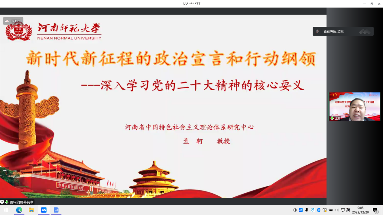 为深入学习宣传贯彻党的二十大精神,教育引导广大干部师生深刻领悟“两个确立”的决定性意义,增强“四个意识”、坚定“四个自信”、做到“两个维护”,12月20日上午,党的二十大精神校内专家宣讲团成员孟轲教授应邀为机关党委、商学院、旅游学院师生代表作了题为《新时代新征程的政治宣言和行动纲领----深入学习党的二十大精神的核心要义》的专题报告,报告会采取腾讯会议的方式,报告会由校党委常委、党委统战部部长、机关党委书记李永贤主持。