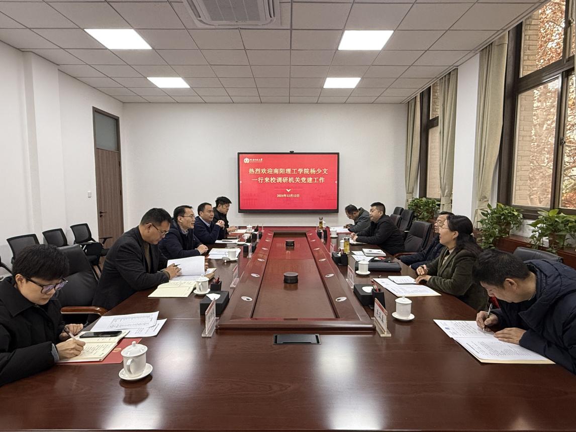 12月12日上午,南阳理工学院学工党委书记杨少文一行5人到我校机关党委调研交流,座谈交流会在勤政楼第一会议室举行。机关党委、党委组织部、党委学工部相关负责人参加会议,座谈会由校党委常委、统战部部长、机关党委书记李志前主持。