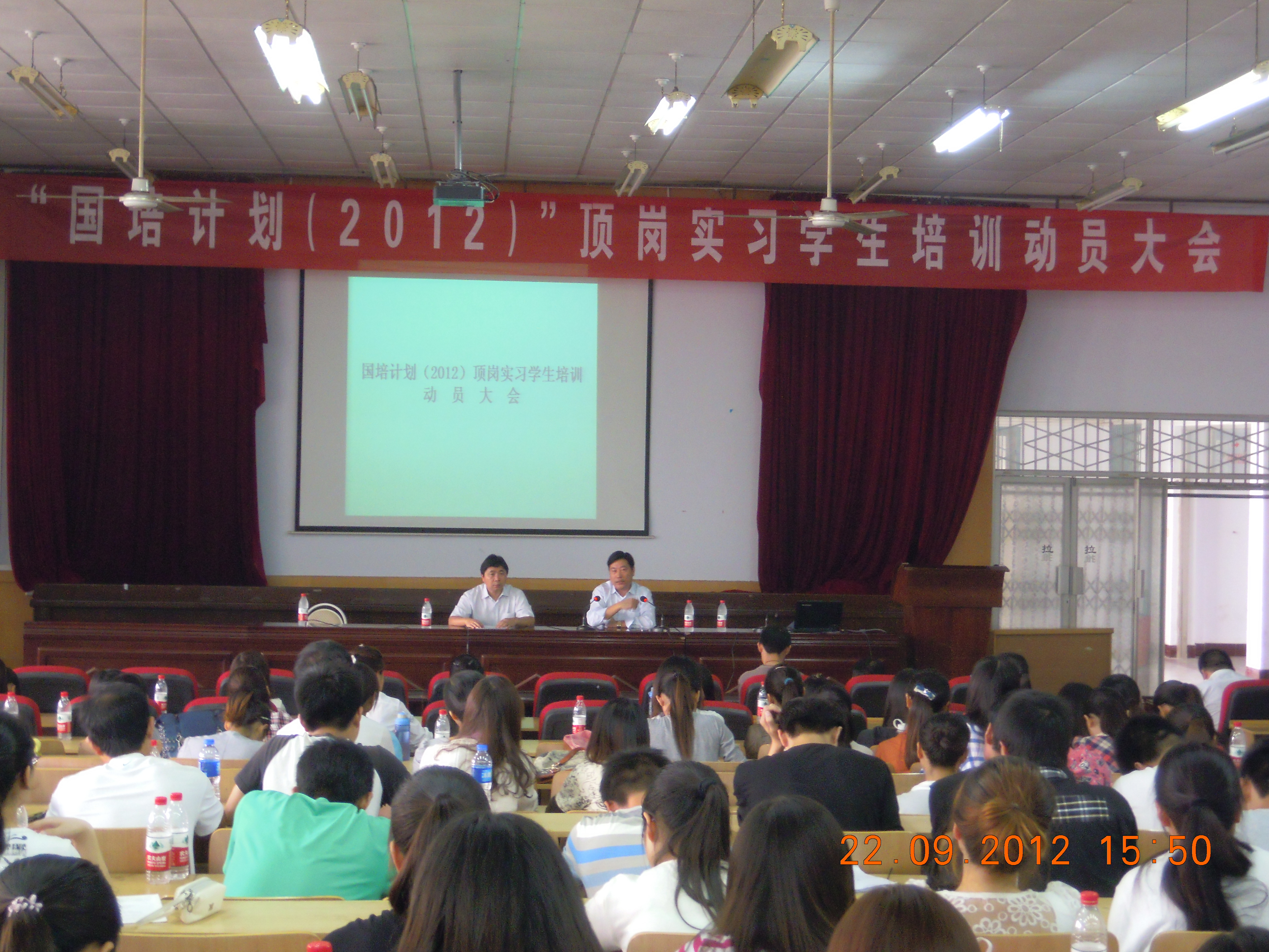根据河南省教育厅《关于进一步做好“国培计划”—河南省农村中小学教师置换脱产研修项目顶岗实习生管理工作的通知》,为使我校顶岗实习学生顺利进入教师角色,适应新的生活和工作环境,学校“国培计划”领导小组于9月23日下午在校团委报告厅召开了顶岗实习动员会,对参加顶岗实习的334名同学进行动员和培训。教务处陈广文处长、继续教育学院武军会院长以及各学院的培训负责人参加了会议。