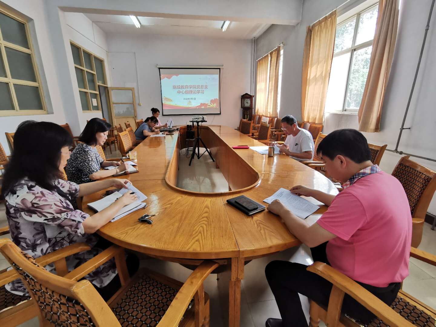 为庆祝建党99周年,响应学校学习贯彻习近平总书记“回信”精神倡议,7月1日上午,继续教育学院党总支在学院二楼会议室召开理论学习中心组会议。会议由党总支书记郭玉主持。