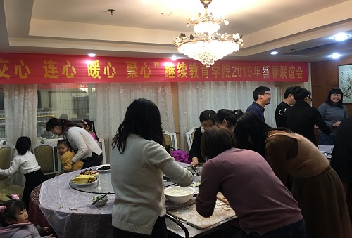 1月25日下午,继续教育学院以“交心、连心、暖心、聚心”为主题举行了2019年新春联谊会。全体教职工欢聚一堂,以茶话会、包饺子的形式表达情谊,喜迎新春,共话发展。
