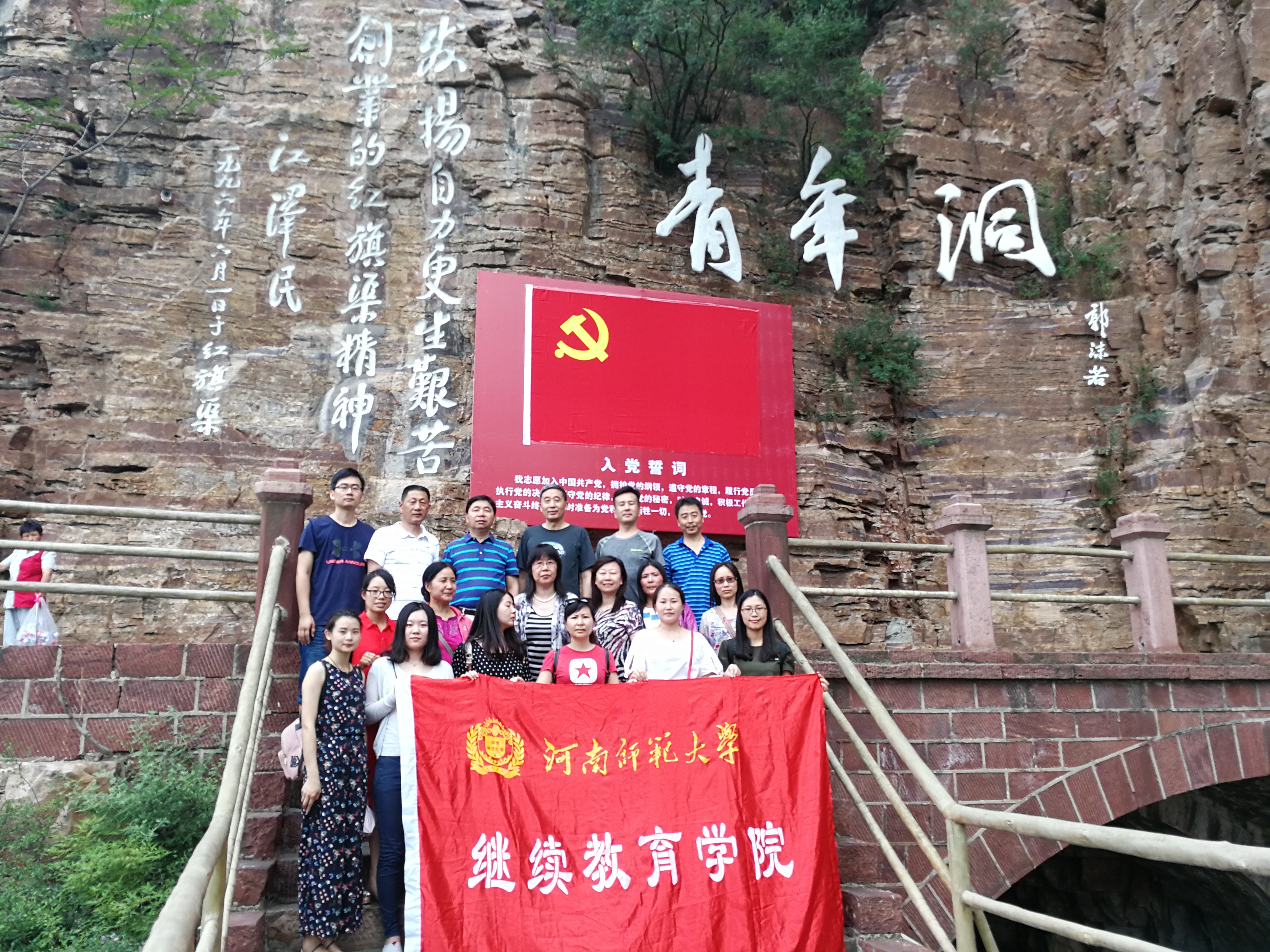 7月4日,继续教育学院党总支组织全体党员干部赴河南省林州市学习红旗渠精神,创新开展主题为“发扬红旗渠精神 做平凡岗位上的先锋楷模”的党日活动,活动期间继续教育学院院长武军会同志结合工作实际,现场讲党课、作引导,各位党员通过党课对红旗渠精神进一步入脑入心,一致表示,要在以后的工作和生活中,把红旗渠精神践行到学校“十三五”发展规划实践和学院各项工作中去,把学习成果转化为谋划工作的思路、解决问题的举措、推动发展的能力,为迎接党的十九大胜利召开取得更加优异的成绩。