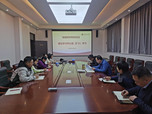 10月31日下午,继续教育学院党总支理论学习中心组扩大学院207会议室专题学习《习近平谈治国理政》第五卷和党的二十届四中全会精神。学院理论学习中心组成员科级以上干部参加学习会议由院党总支书记张喜平主持。