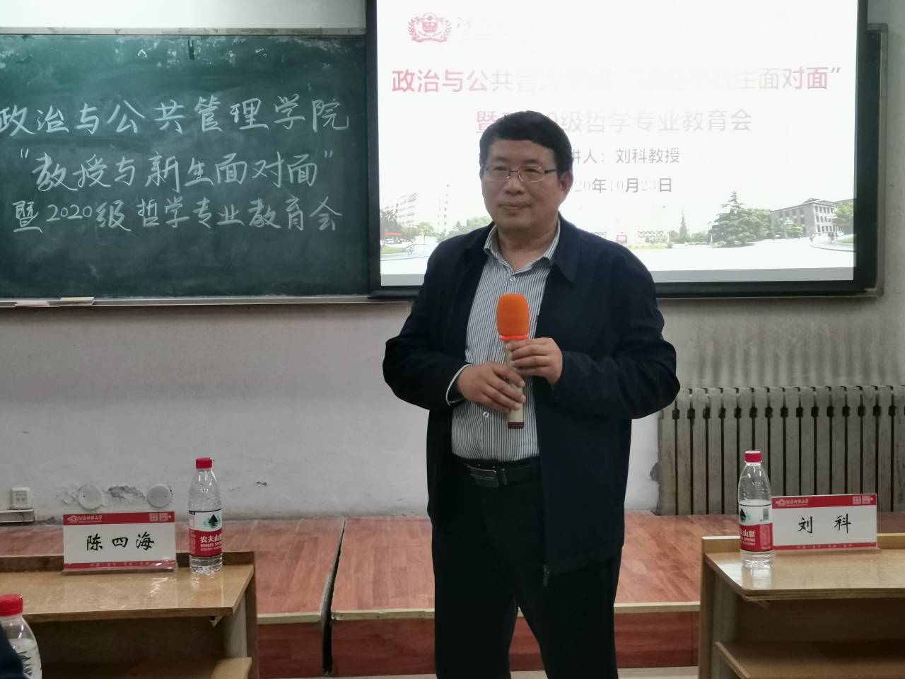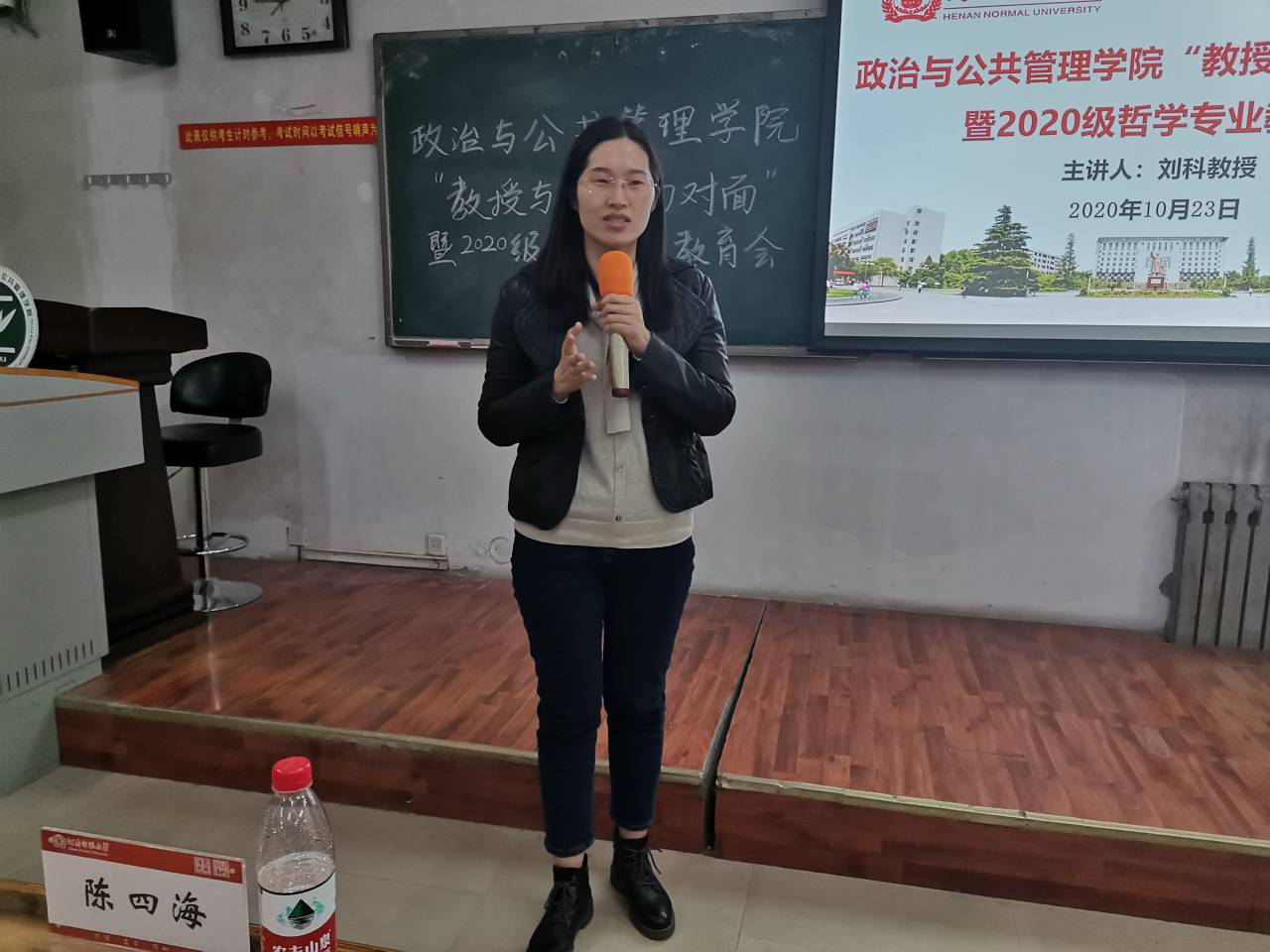2020年10月23日晚上7点,哲学学科在求是西楼103教室举行2020级哲学本科生师生见面会及专业教育活动。出席本次活动有哲学重点学科带头人、伟德官网下载苹果版学报编辑部主任、博士生导师刘科教授,政治与公共管理学院副书记张瑾老师,以及安道玉、谢彩霞、王海琴、赵西方、张保伟、陈四海、于建东、田甲乐、张艳伟、惠永照、张昊雷、李广宇、陈永庆等哲学学科的教师代表,辅导员马文韬、魏真玉和梅苗苗,以及2020级哲学本科专业的28位新同学。