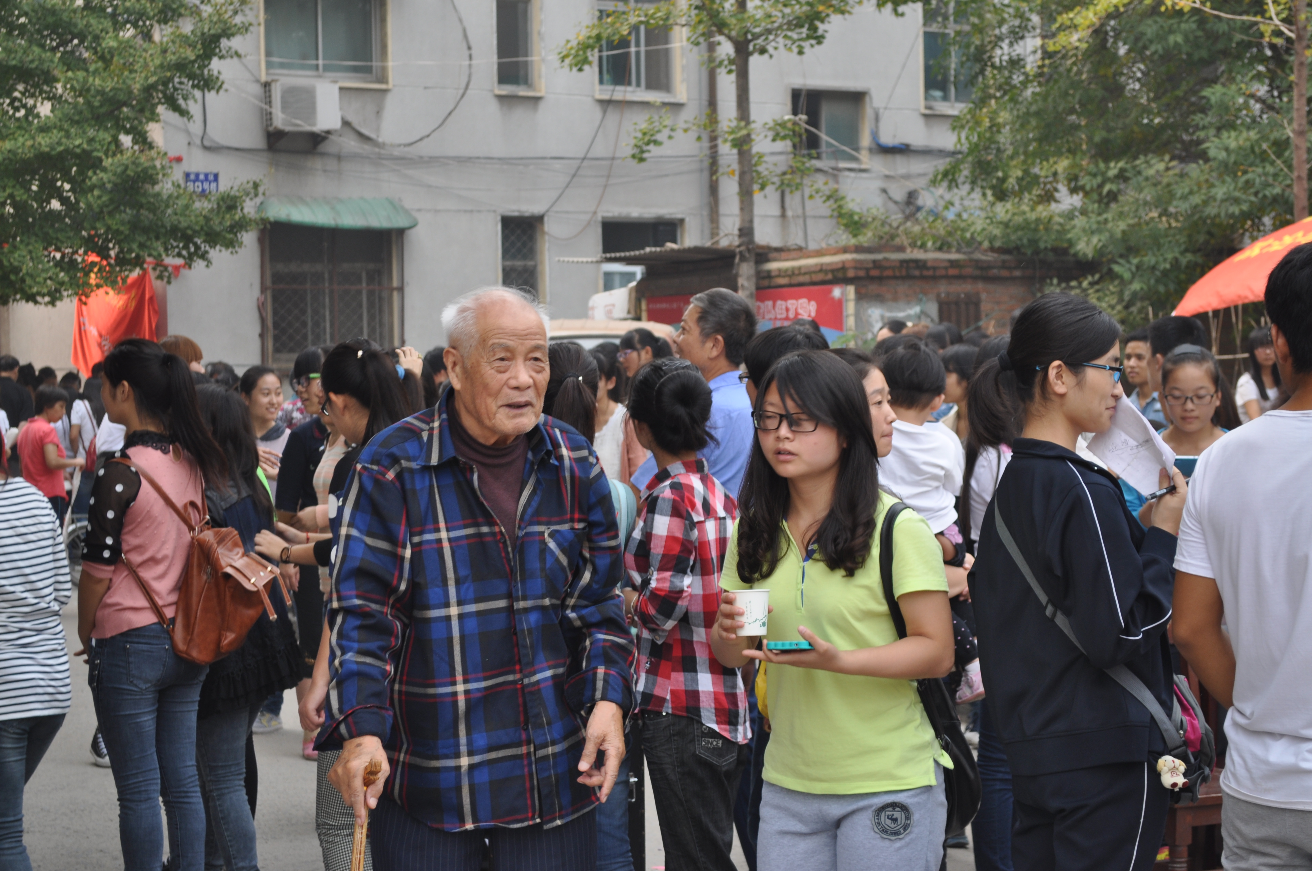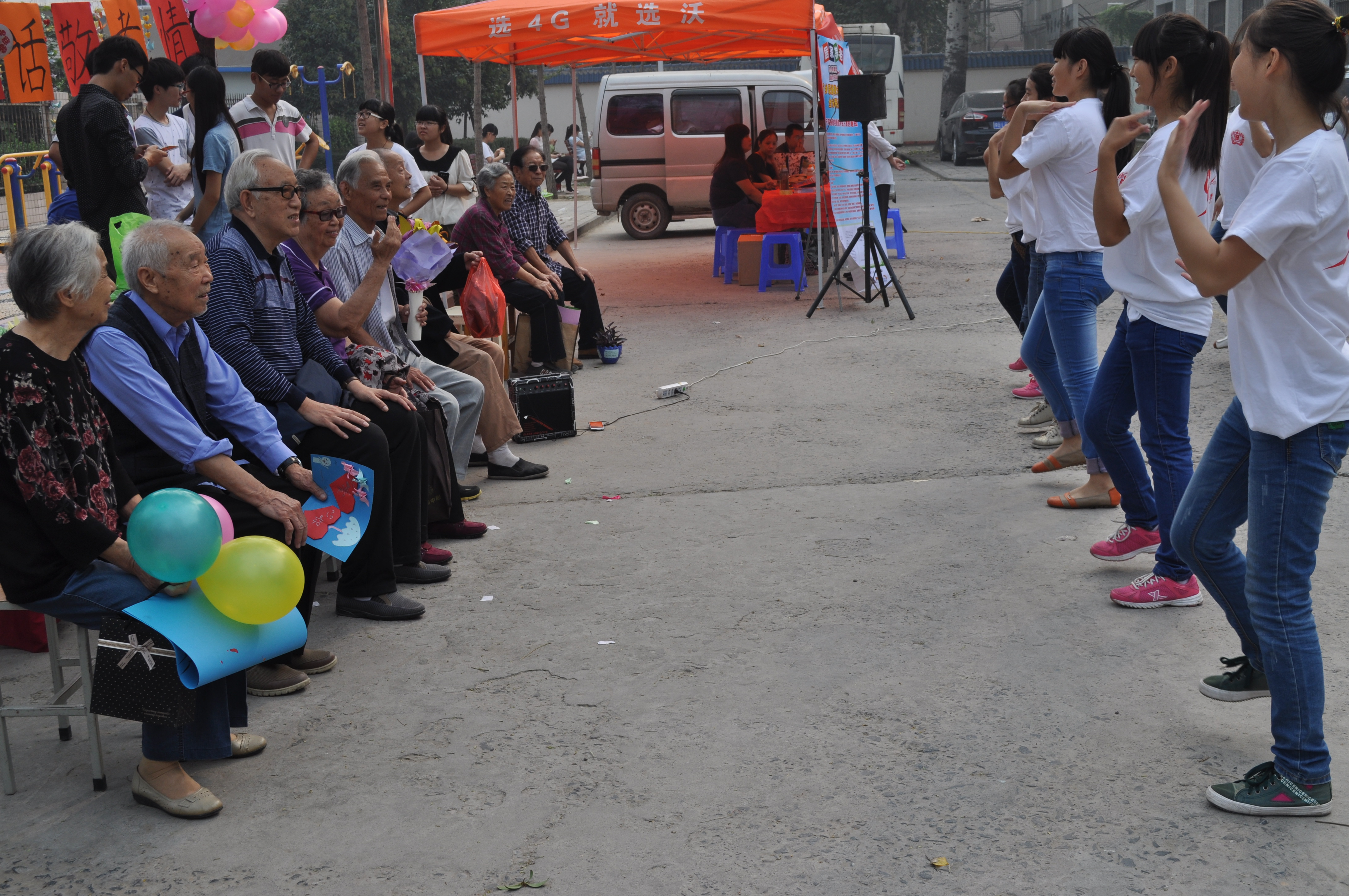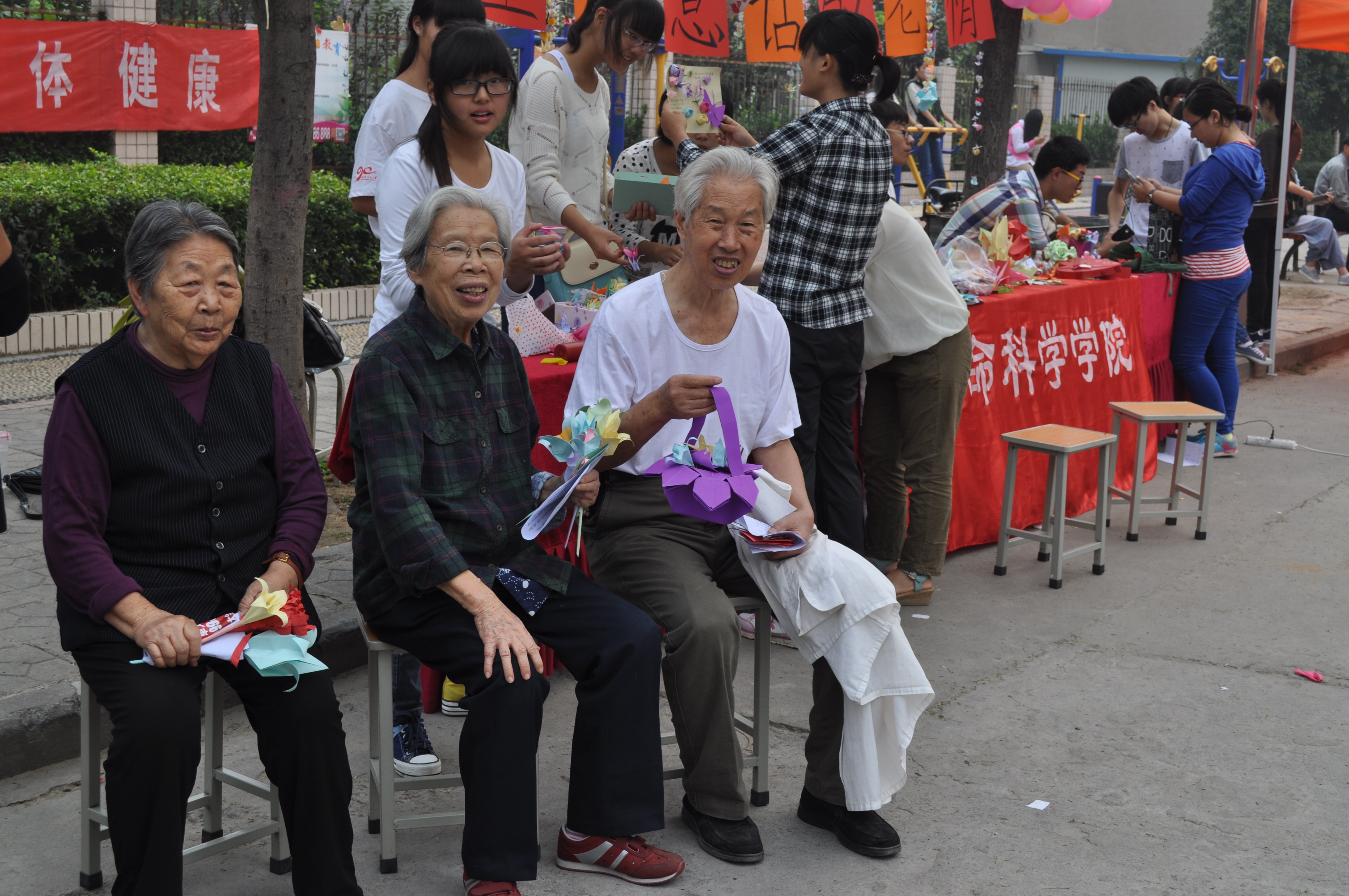 9月27上午8点,家属院主干道两侧,后勤集团、校医院以及各院系志愿服务部的同学们结合自身专业优势,以各种形式为老人们送上祝福。校医院由医生坐诊,免费为老人量血压,并提供医疗咨询;后勤集团义务通过开展刨案板、销售平价商品等活动;有些老人尽情为同学们书写书法;学生会组织的演出,和老人互动,深受欢迎;生命科学学院学生为老同志献花、宣传秋季健康小常识;数学与信息科学学院学生的千纸鹤、整齐的动感舞蹈等表达了对老人的深深祝福;美术学院为老人们义务画像、化学化工学院带来了各种手工艺品、经济与管理学院、外国语学院、物理与信息工程学院、政治与管理科学学院、文学院等都展示出了各自不同的服务项目,为老人们志呈献爱心表达慰问,送去一份关心与问候。