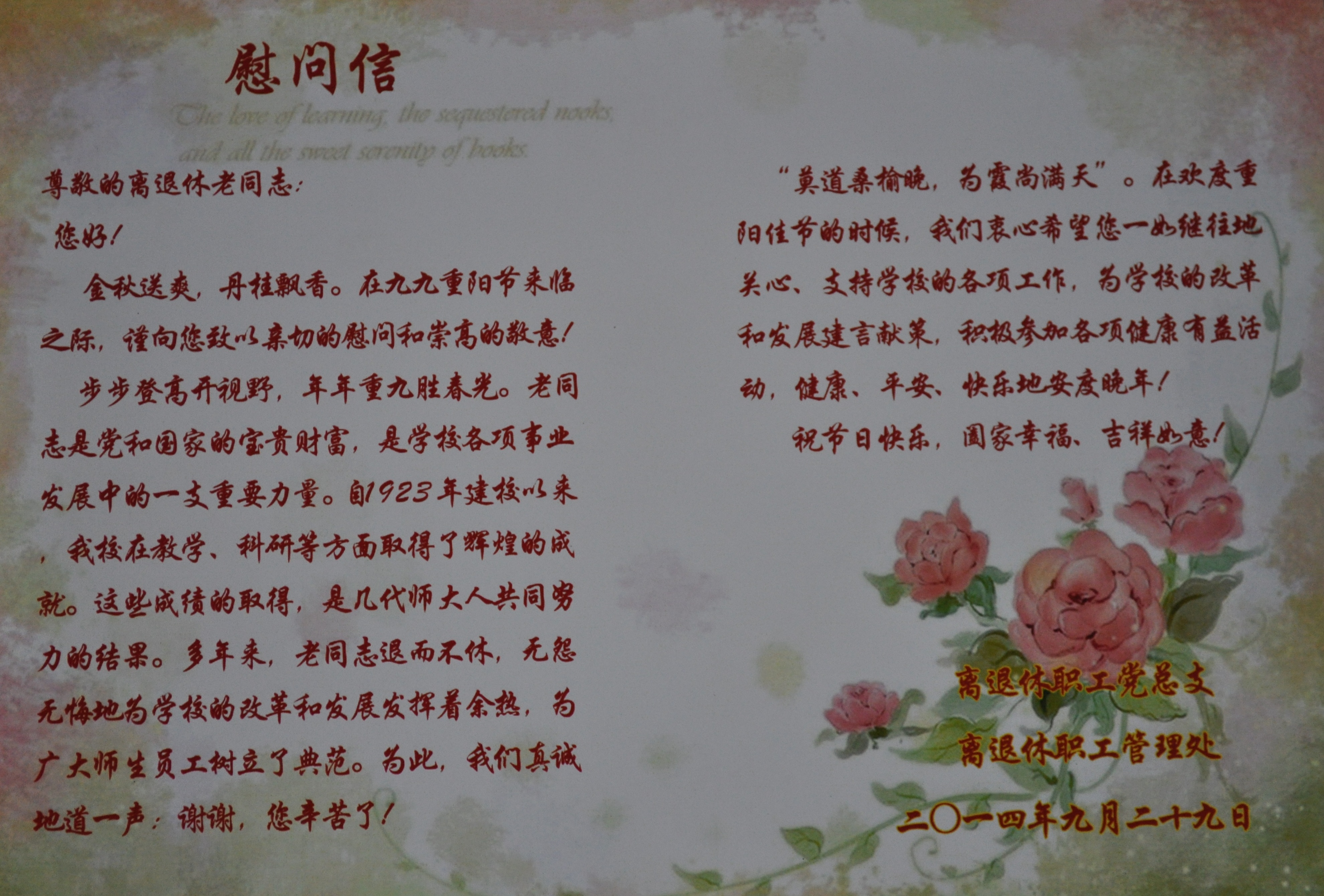 金秋送爽,丹桂飘香。在九九重阳节来临之际,离退休职工管理处王淑婷书记、黄斌处长携全处人员看望在校离休干部,并向全校的离退休老同志们致以亲切的慰问和崇高的敬意!