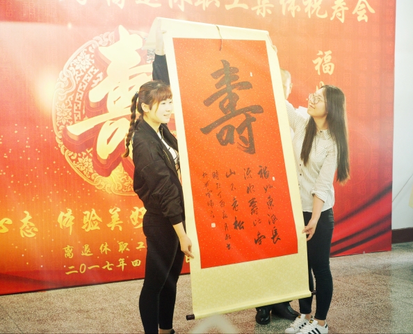 退休职工代表罗晓凤同志致贺词。原校长王绍令代表全体寿星发了言,他感谢学校和离退休职工管理处对老同志的关怀和关注,表示要继续发挥余热,关心和支持学校各项事业发展,希望老同志要积极展示阳光心态、体验美好生活、畅谈发展变化,以健康的身体和良好的心态发挥好余热、为学校的发展再做新贡献。老年书画院池月新同志挥毫泼墨,为祝寿会献上了“福如东海长流水、寿比南山不老松”的对联。