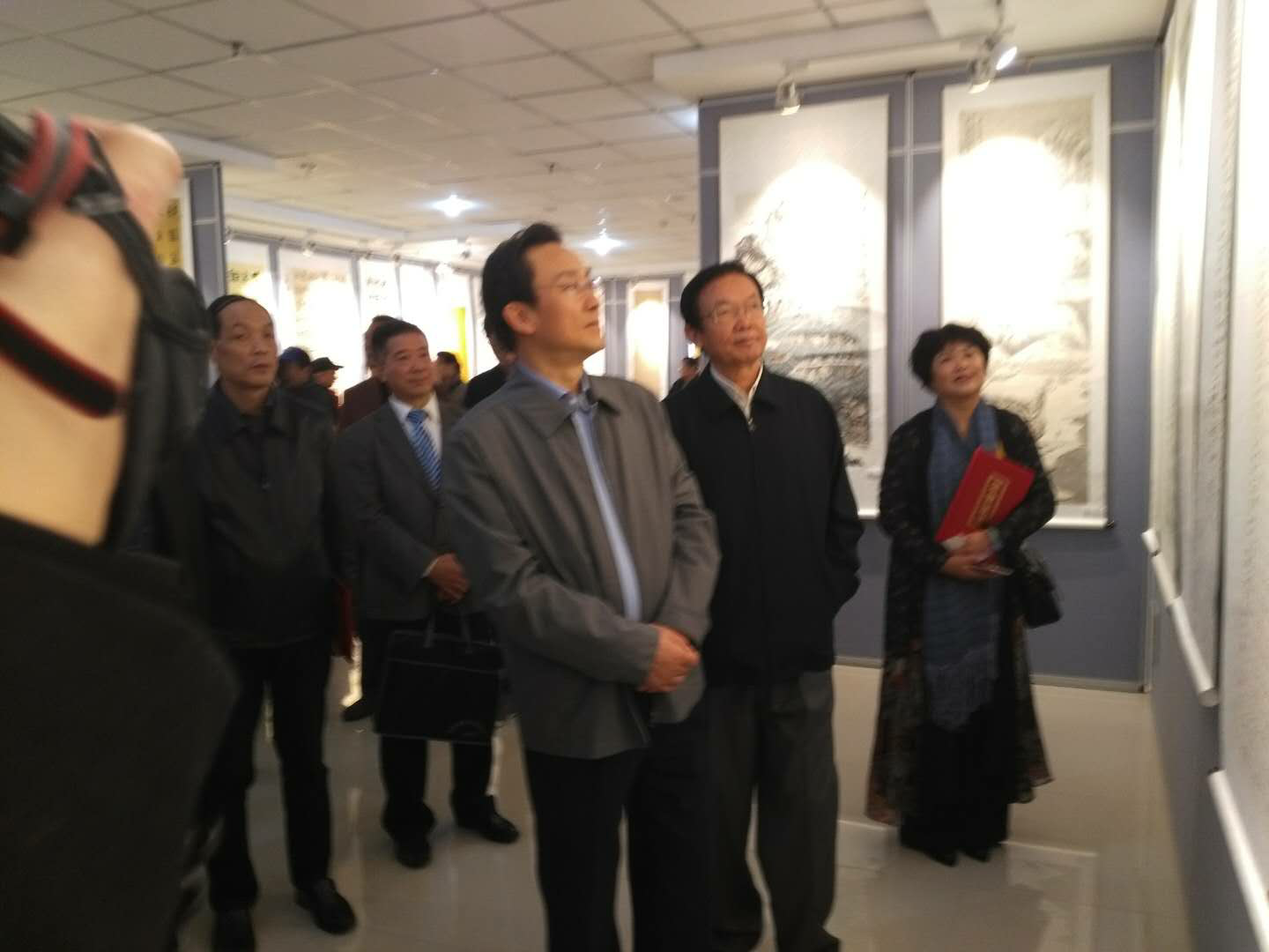 (图为:孔昌生同志在观赏池月新老师的作品行书《爱莲说》,称赞作品“行云流水、清丽秀气”)