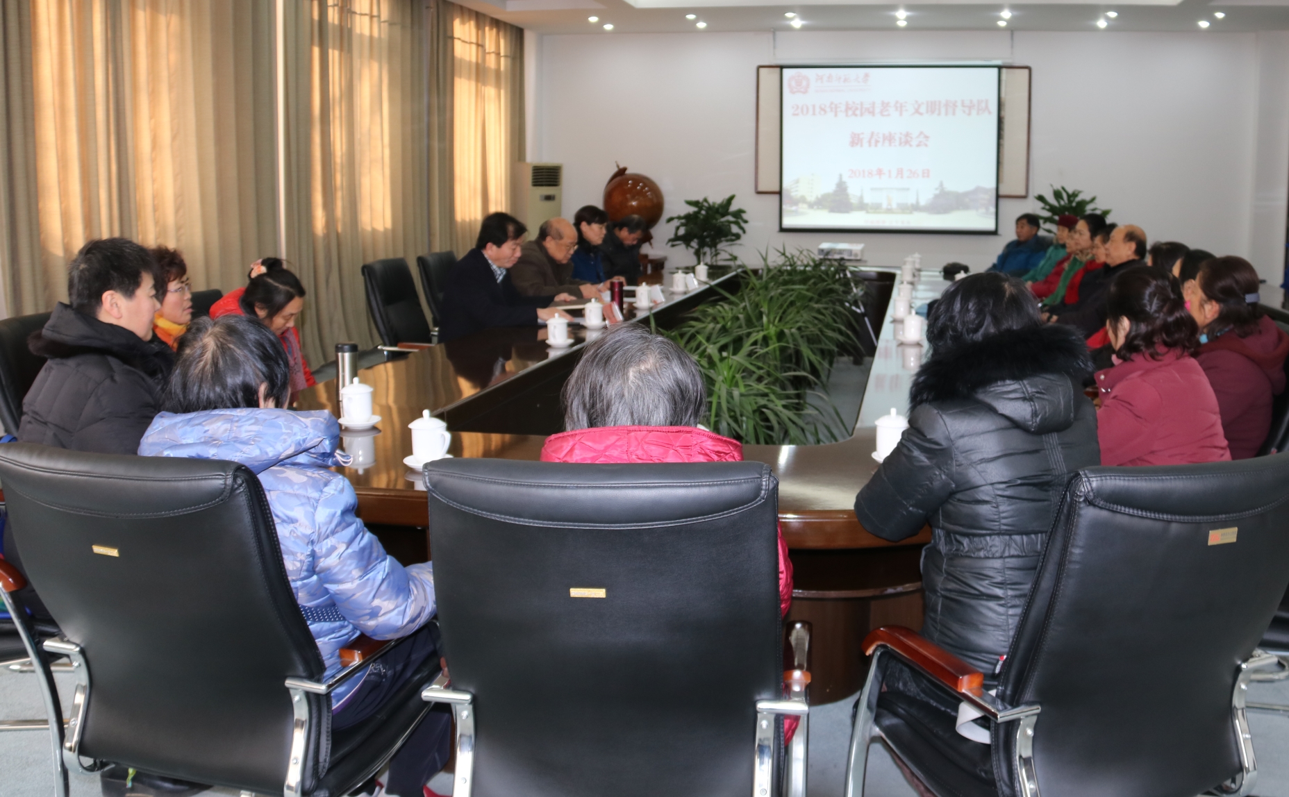 1月26日下午,我校校园老年文明督导队新春座谈会在勤政楼第一会议室召开。校关工委负责人周铁项、党委宣传部部长聂立清及20多名校园老年文明督导队成员参加了会议。会议由关工委办公室主任王淑婷主持。