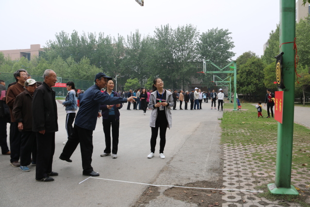本次运动会共设有“保龄球”、“投标”、“投筐”、“夹玻璃球”、“小球投篮”等六个达标项目。比赛期间,老同志们积极参与,努力争取,引来了围观同学们的加油助威。篮球场上充满了欢声笑语,洋溢着青春和谐气氛。