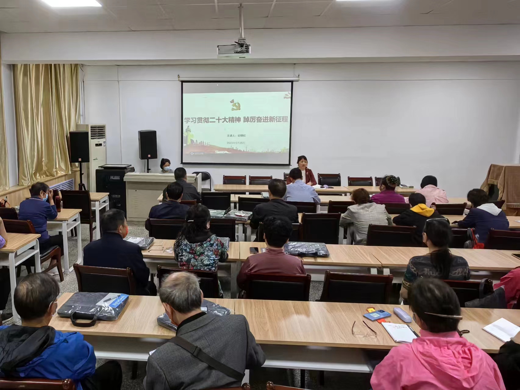 为推动学习宣传贯彻党的二十大精神,开展学习贯彻习近平新时代中国特色社会主义思想主题教育,5月25日,离退休职工党委进行了“学习贯彻党的二十大精神 砥砺奋进新征程”主题党课活动,由离退休职工党委书记纪晓红担任主讲,全体在职职工及各离退休党支部书记、支部委员、各行政组副组长参加会议。