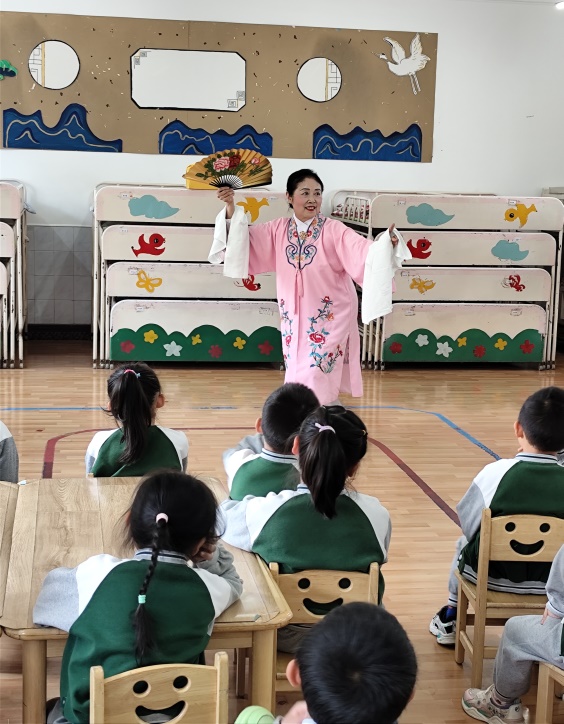 为了激发孩子兴趣,两位老师用浅显易懂、生动有趣的词汇和富有感染力的动作对孩子们进行了京剧入门教育,并给孩子们带来了《贵妃醉酒》《穆桂英挂帅》两段精彩的演出,孩子们听得津津有味,兴趣盎然,在开心和欢笑声中体会了国粹艺术的精彩。