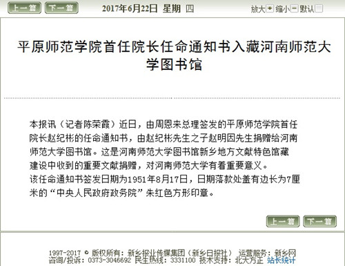 2017年6月22日《新乡日报》报道——《平原师范学院首任院长任命通知书入藏伟德官网下载苹果版图书馆》。
