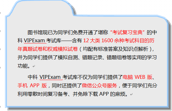 ?长按识别下图二维码、关注中科VIPExam考试库微信公众号,即可免费使用考试库。