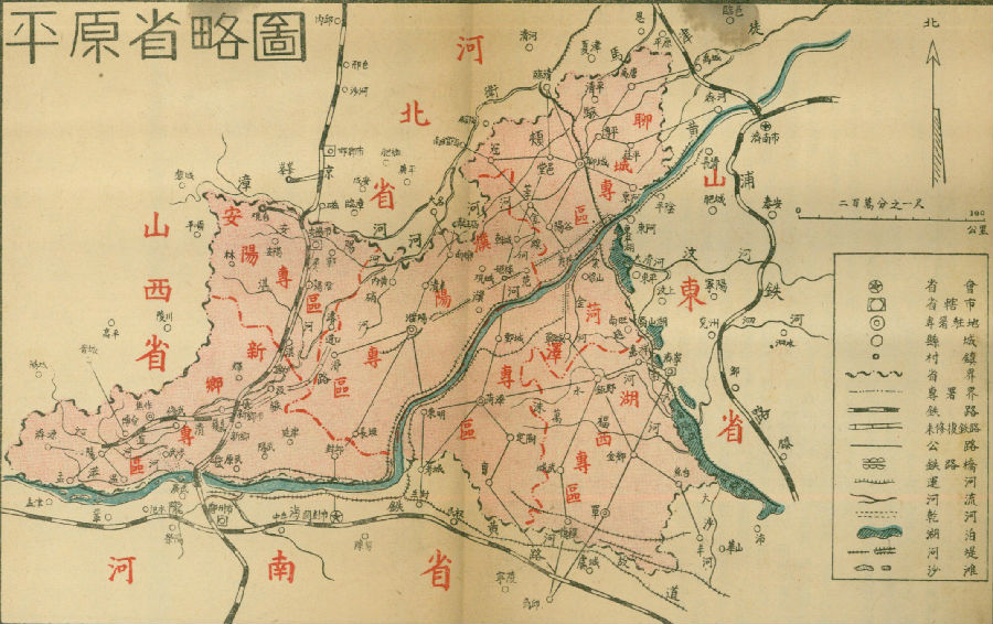 目前,我中心共收藏新乡地图近百幅,而且种类多样、时间跨度大,如新中国成立初期的《平原省分县详图》、1950年的《新乡市地图》、1955年的《新乡专区分县区划图》、1969年的《新乡地区图》、20世纪80年代的《新乡地区黄河故道沙区林业现状、造林设计示意图》、1989年的《晋冀鲁豫接壤地区交通游览图》、1992年的《获嘉县政区图》、2005年的《新乡市交通旅游图》、2016年的《新乡市地图》和《新乡市区图》等。这些地图绘就了新乡的综合性历史和文化,如远古遗址、夏商周、疆域、政区、民族、人口、文化、宗教、农牧、工矿、近代工业、城市、旅游、交通、战争、地貌、植被、动物、气候、灾害等。