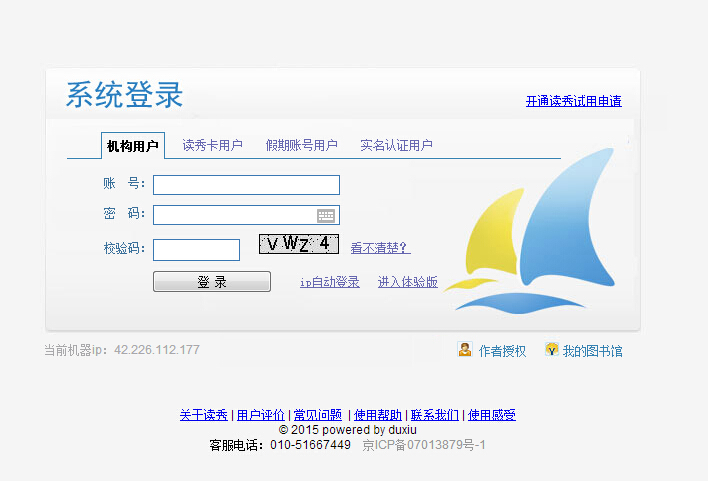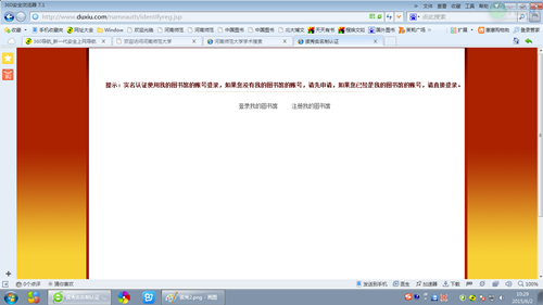 亲们在校外登录读秀主页(http://www.duxiu.com)时会发现和在学校用的时候打开的不一样,会出现这样的界面: