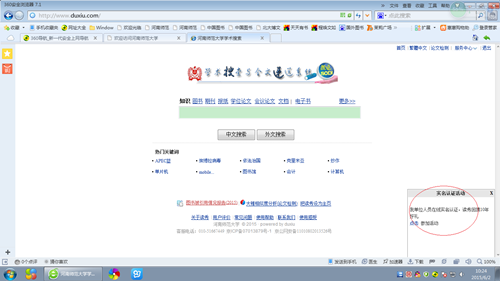点击页面上的链接地址:http://www.duxiu.com,进入到读秀搜索的检索界面,右下角会弹出“消息提示”框,请你按提示操作