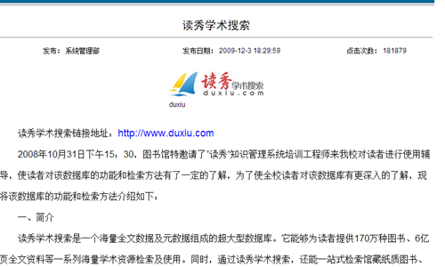 经过图书馆信息咨询部老师和《读秀学术搜索》数据库协商,读秀学术搜索首次在我校开通实名认证服务了!认证成功后,亲们无论在哪儿都可以免费使用读秀10年。此活动6月底截止,亲们把握机会,抓紧注册啦!