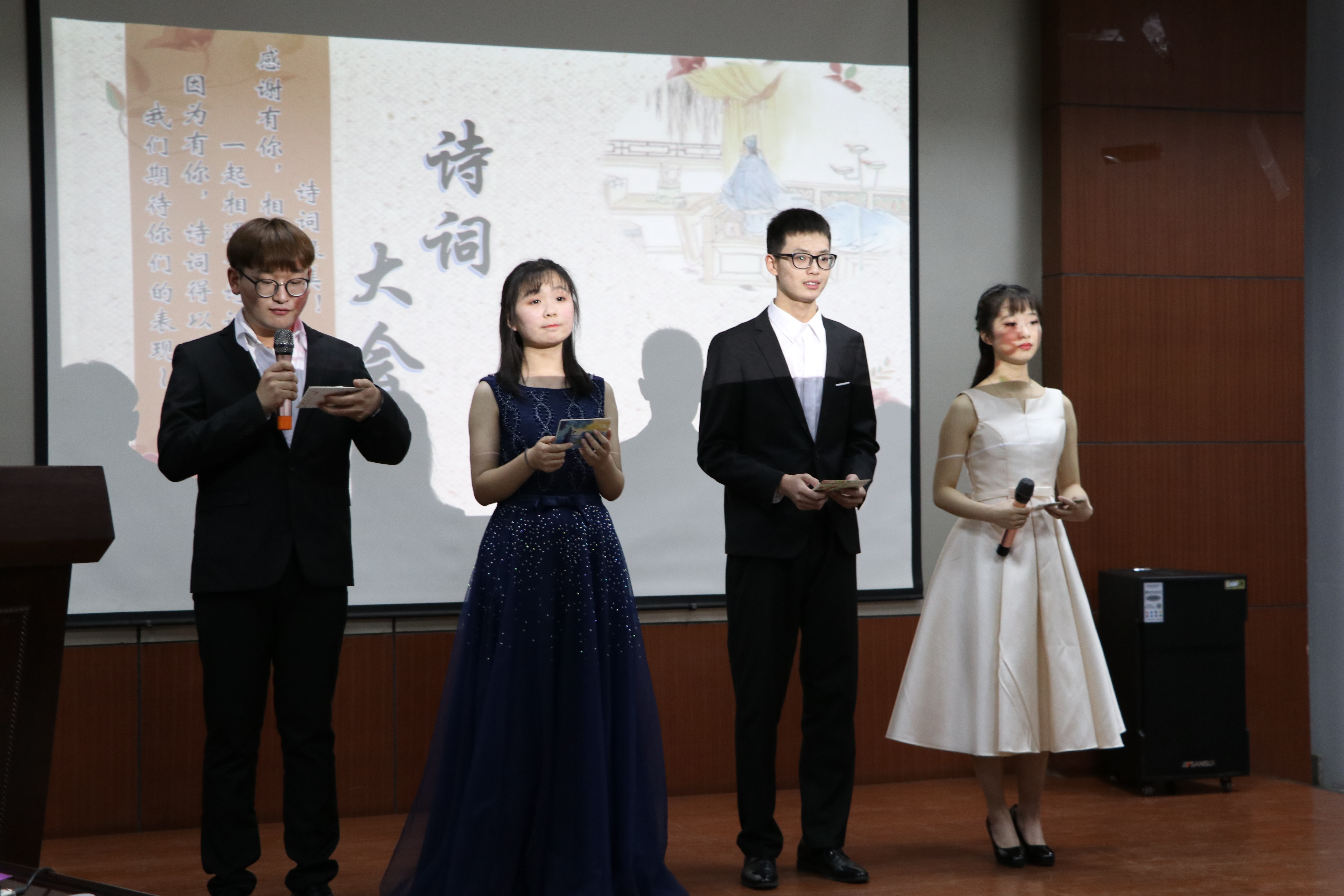 比赛伊始,主持人向到场的观众介绍今天的评委。随后,参赛选手被分为若干小组进行比赛,比赛过程中他们竞相用优美的诗词展示自己的风采,反映出了选手们深厚的诗词功底。经过几番比试,半决赛结束,十位优秀选手脱颖而出,成功晋级决赛。中场休息时,非物质文化遗产保护协会成员带来的歌曲表演《泡沫》,再次调动全场的氛围;同时,伟德官网下载苹果版读者协会带来的幽默小品也获得了全场热烈的掌声。决赛过程中,两位决赛选手势均力敌,比赛进入了加时赛,他们以其铿锵有力的气势,充沛饱满的感情,自信大方的形象赢得了观众们的阵阵掌声,经过几个小时的激烈角逐,路畅同学凭借着深厚的诗词功底和从容不迫的应赛态度赢得了本次比赛的总冠军。