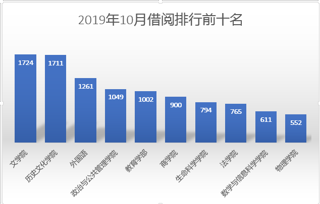 本次发布的是2019年10月借阅地图TOP TEN。前十名分别为:第一名,文学院,1724册;第二名,历史文化学院,1711册;第三名,外国语学院,1261册,第四名,政治与公共管理学院,1049册;第五名,教育学部,1002册;第六名,商学院,900册;第七名,生命科学学院,794册;第8名,法学院,765册;第九名,数学与信息科学学院,611册;第十名,物理学院,552册。