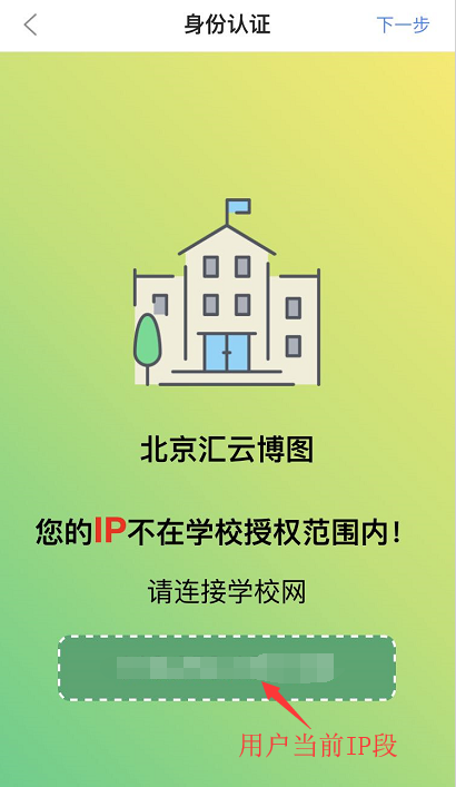 若为校园网IP,则点击右上角下一步进行注册;若不为校园网IP,则无法验证通过,需要用户连接校园网后再注册。