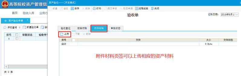 点击首页【我要报增】--【验收入库】--【资产验收申请】--【新建验收单】--完善表单表头信息—点击表体的【选择卡片】进行卡片选择—点击【附件材料】可上传资产相关证明材料--【保存】--【提交】审核。