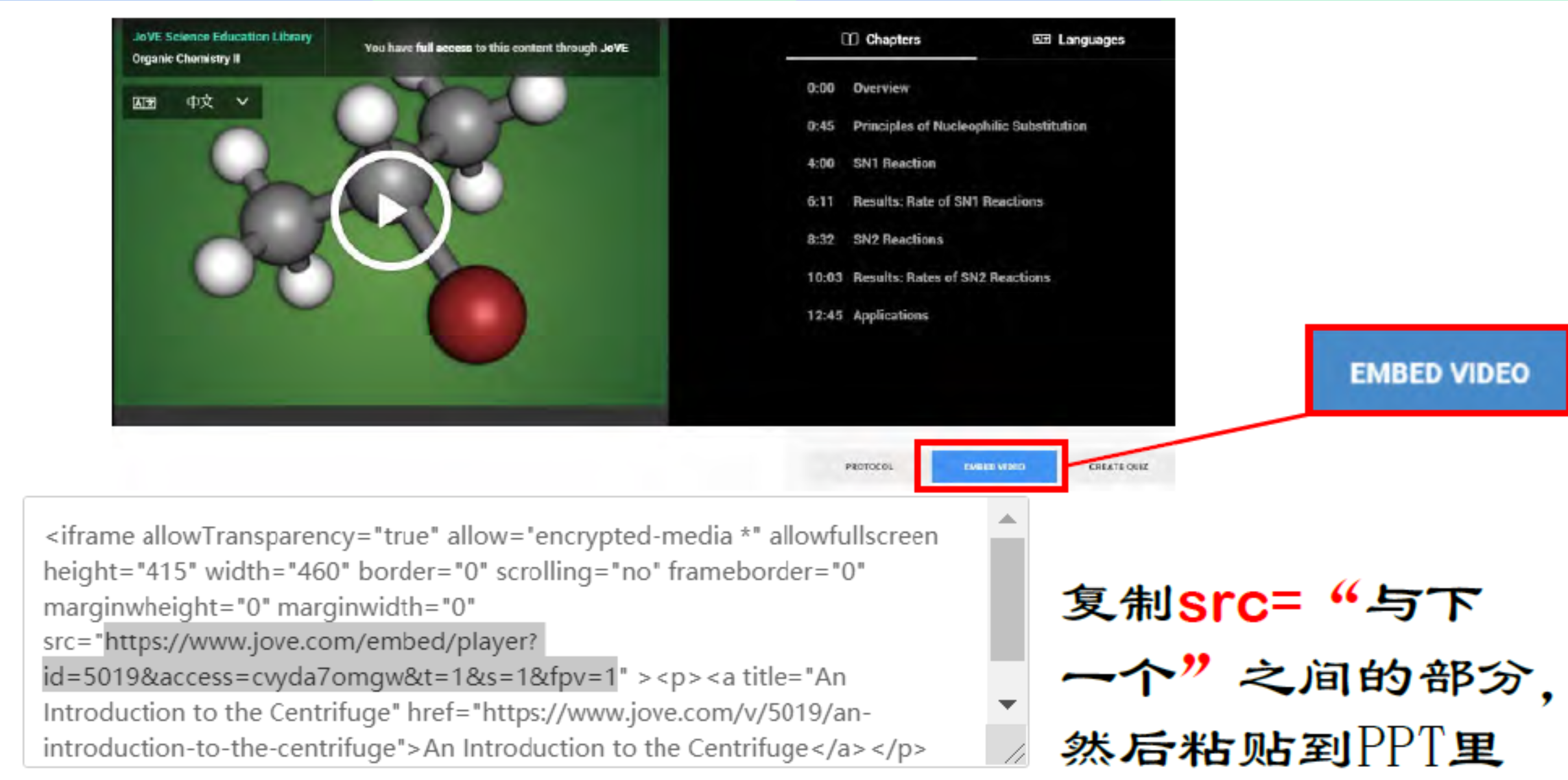 JoVE Science Education科教视频库配备有中英文字幕,可以通过点击视频右下方的CC图标选择不同语言版本的字幕。