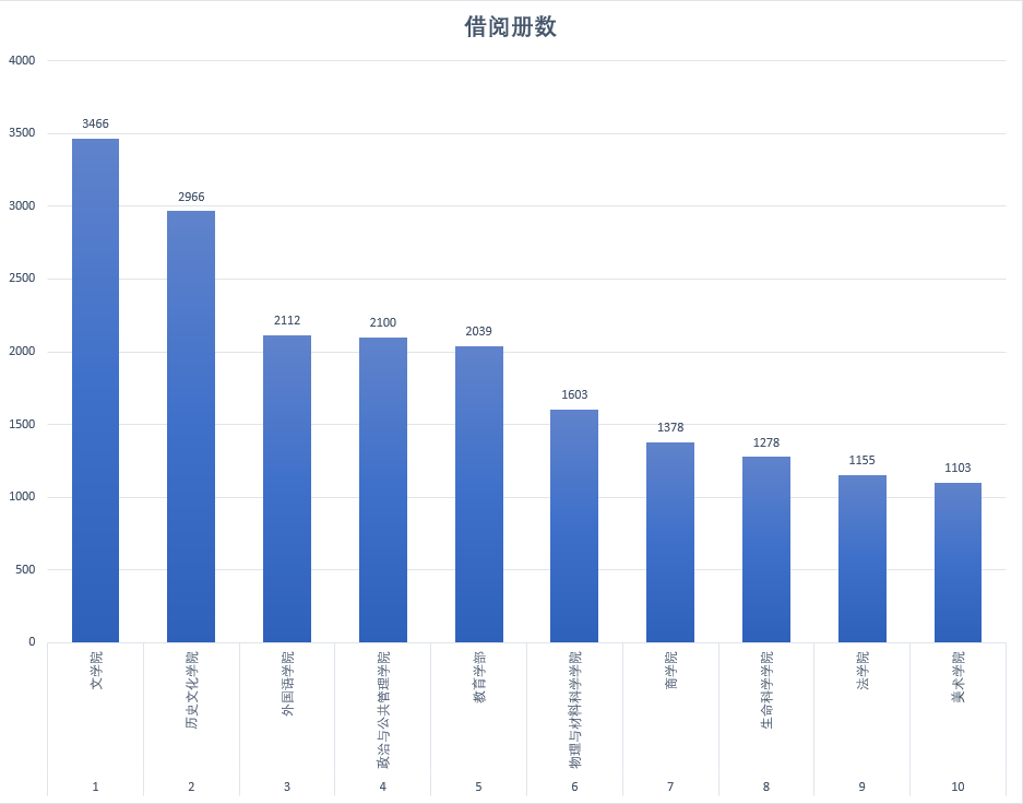本次发布的是2020年9、10月借阅地图TOP TEN。前十名分别为:第一名,文学院,3466册;第二名,历史文化学院,2966册;第三名,外国语学院,2112册,第四名,政治与公共管理学院,2100册;第五名,教育学部,2039册;第六名,物理与材料学院,1603册;第七名,商学院,1378册;第8名,生命科学学院,1278册;第九名,法学院,1155册;第十名,美术学院,1103册。