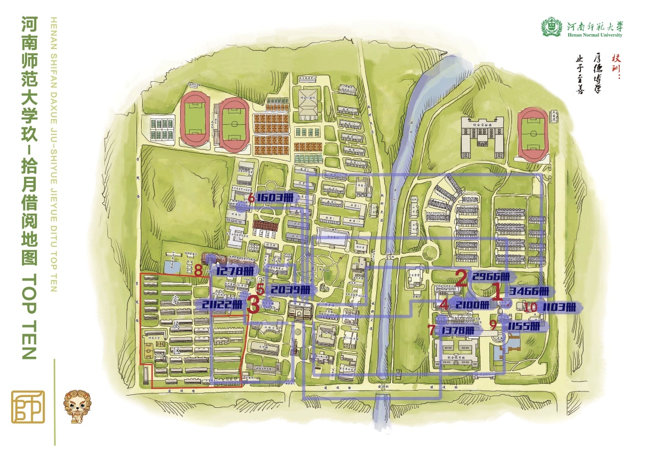 为促进我校全民阅读深层次发展,图书馆基于大数据推出我校“借阅地图TOP TEN”。根据我校25个学院(部)每月借阅情况,选择前十名在我校地图上进行标注。每月发布一次,可使各个学院及时了解本学院每月学生的借阅情况,促进学生培养工作。