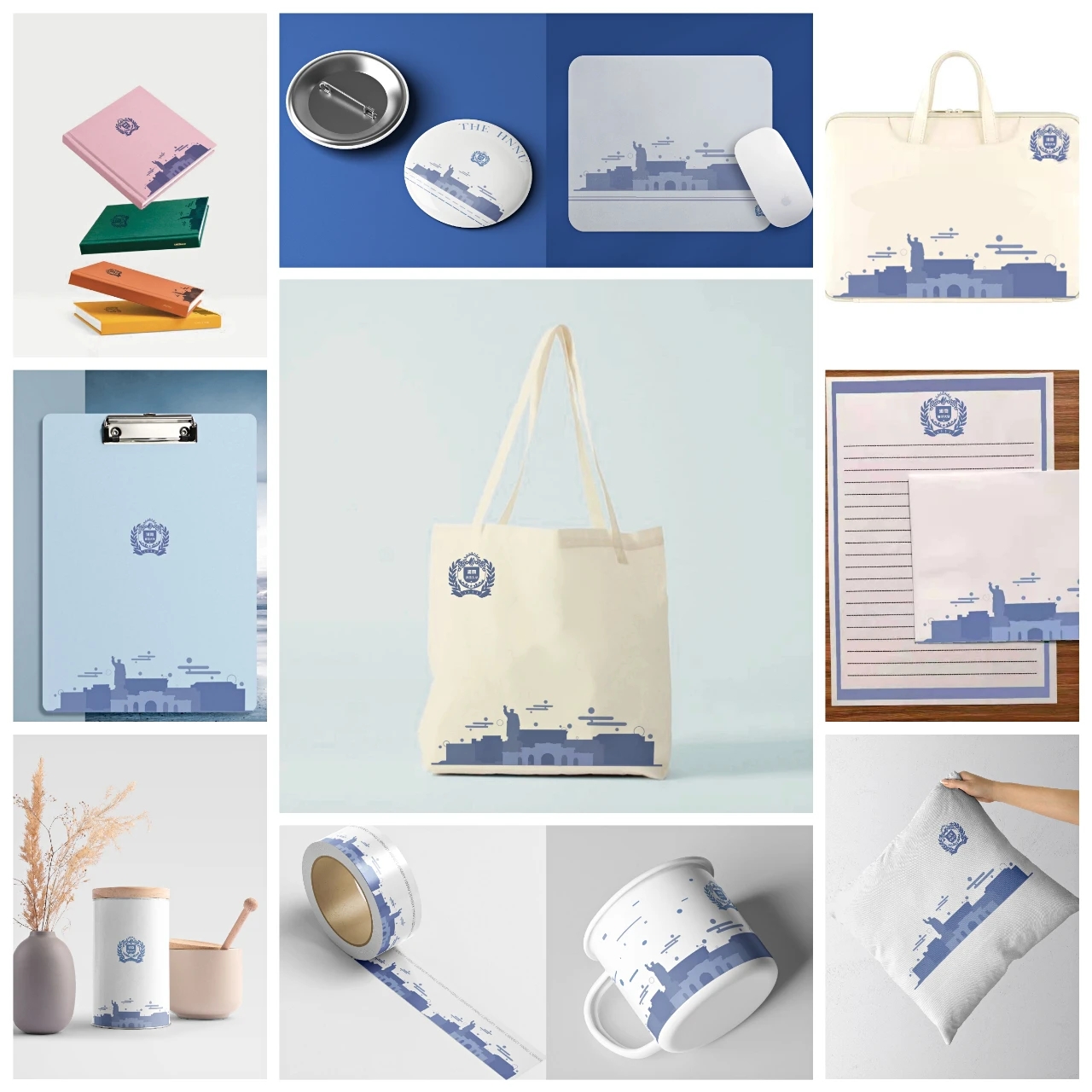 本次发布的文创产品由图书馆师图文创工作室设计,采用校园正门、毛主席立像、图书馆、勤政楼、启智楼、文渊楼、田家炳楼等标志性建筑的剪影描绘师大。该系列文创产品首批共有十二种,分别为帆布包、小方镜、垫板、电脑包、鼠标垫、马克杯、抱枕、徽章、信封信纸、和纸胶带、茶叶罐、笔记本。此次文创产品通过不同蓝色的交错运用描绘出不同建筑的轮廓,通过颜色的递进显示出建筑的层次感。