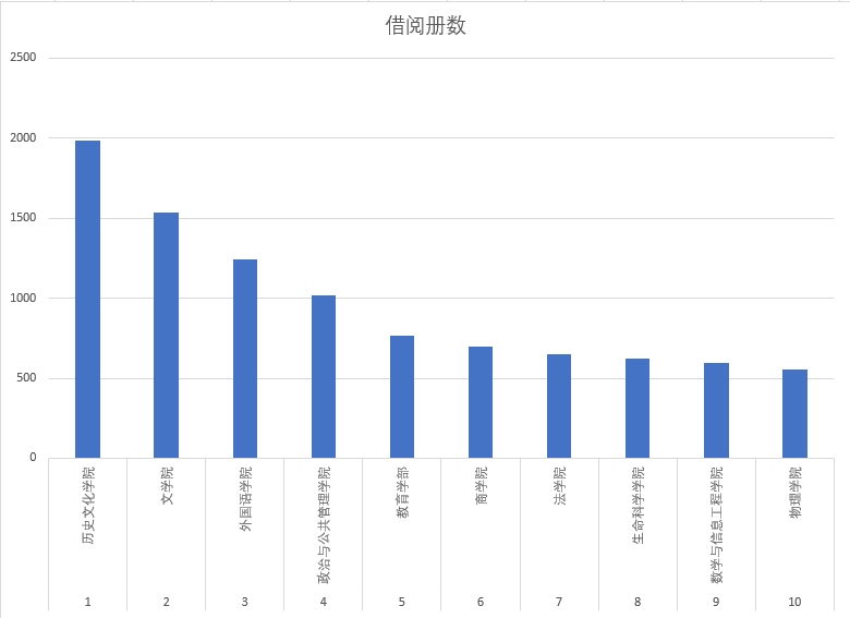 本次发布的是2020年11月借阅地图TOP TEN。前十名分别为:第一名,历史文化学院,1983册;第二名,文学院,1537册;第三名,外国语学院,1246册,第四名,政治与公共管理学院,1017册;第五名,教育学部,767册;第六名,商学院,701册;第七名,法学院,650册;第8名,生命科学学院,621册;第九名,数学与信息工程学院,595册;第十名,物理学院,555册。